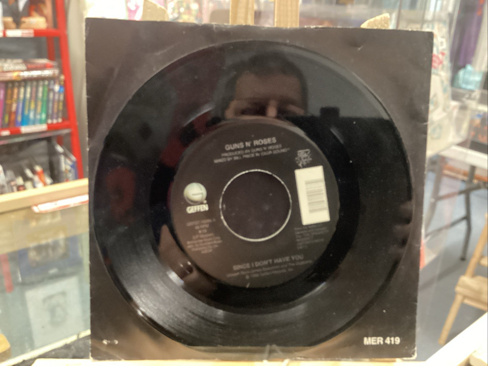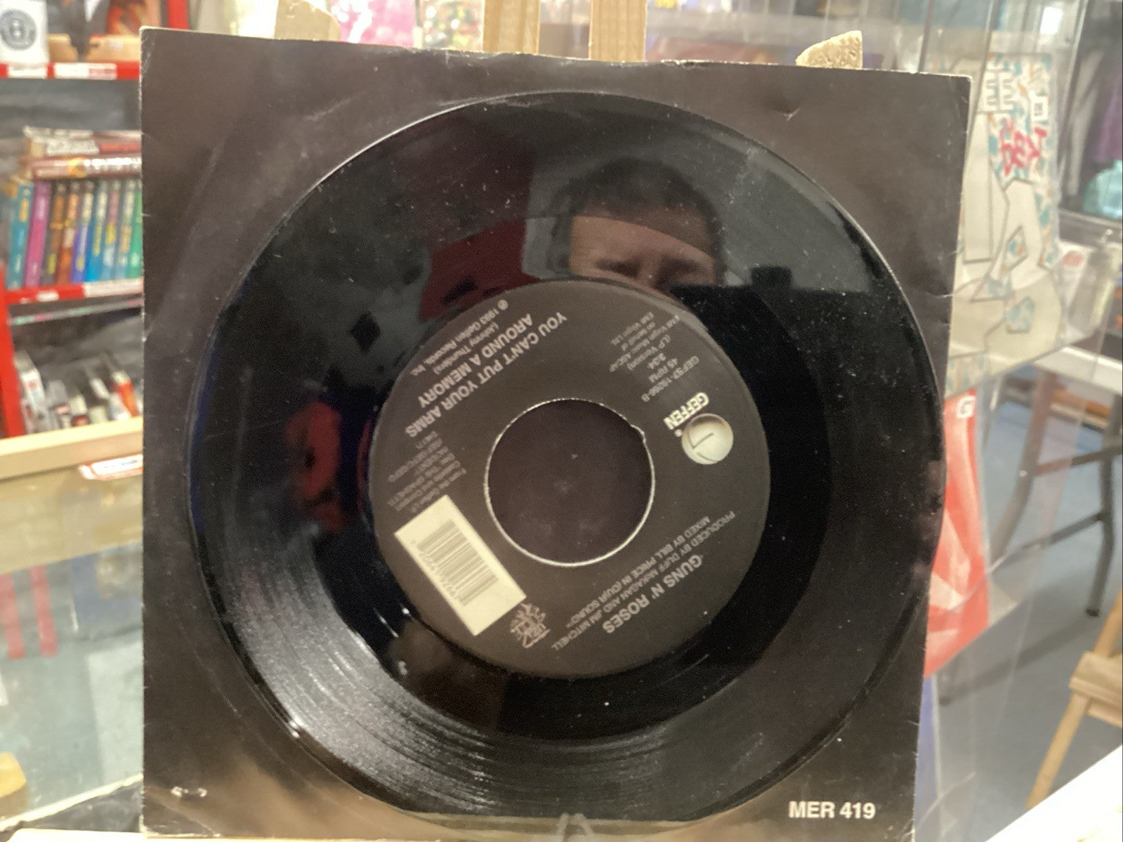 This product is a 7" vinyl single by Guns N' Roses, released in 1994 under the record labels Geffen Records and Uzi Suicide. The record features the songs "Since I Don't Have You" and "Can't Put Your Arms Around Me" by the rock band. The vinyl is in good condition, with a very good plus sleeve grading, and was manufactured in the US. This collectible piece of music history is a must-have for fans of Guns N' Roses and vinyl records.