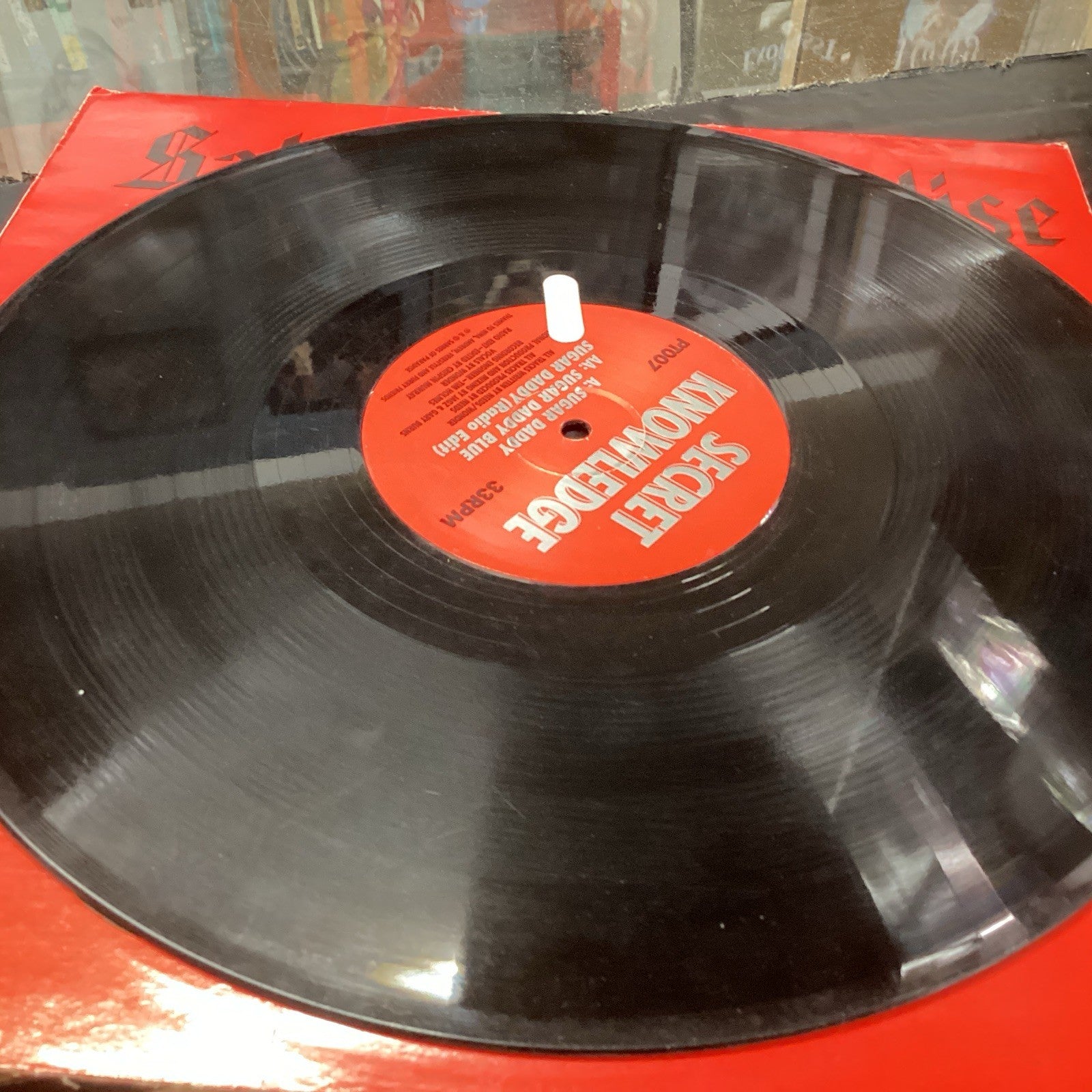 The product is a 12" vinyl record titled "Sugar Daddy" by the artist Secret Knowledge, released in 1993 by the record label Sabres Of Paradise. The record grading is Good Plus (G+), and the sleeve grading is Fair (F). This classic music genre vinyl is a must-have for collectors and fans of electronic music from the early 90s.