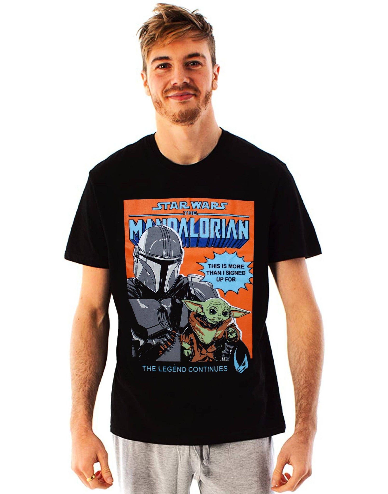 The legend continues with this awesome Star Wars The Mandalorian t-shirt for men; it is an awesome gift for fans of the original Star Wars movie episodes. The Mandalorian poster shirt for adults comes with a stylish black standard fit, perfect for chilling out and watching your favourite series, The Mandalorian! Showcased across the front of the Star Wars tee for adults is a bold and colourful Mandalorian poster featuring the Mandalorian and iconic Baby Yoda with a quote 'THIS IS MORE THAN I SIGNED UP FOR' contrasted against the black Baby Yoda top. The Mandalorian clothing for him and her comes with a crew neck and short sleeve style and is made from 100 percent cotton for a soft and comfortable feel. Add some mysterious Baby Yoda excitement to your wardrobe with this awesome Mandalorian t-shirt for men and women; it is available in sizes small, medium, large, x-large, xx-large and xxx-large. This item is 100 percent genuine licensed Star Wars merchandise and features official branding throughout. We want yo
